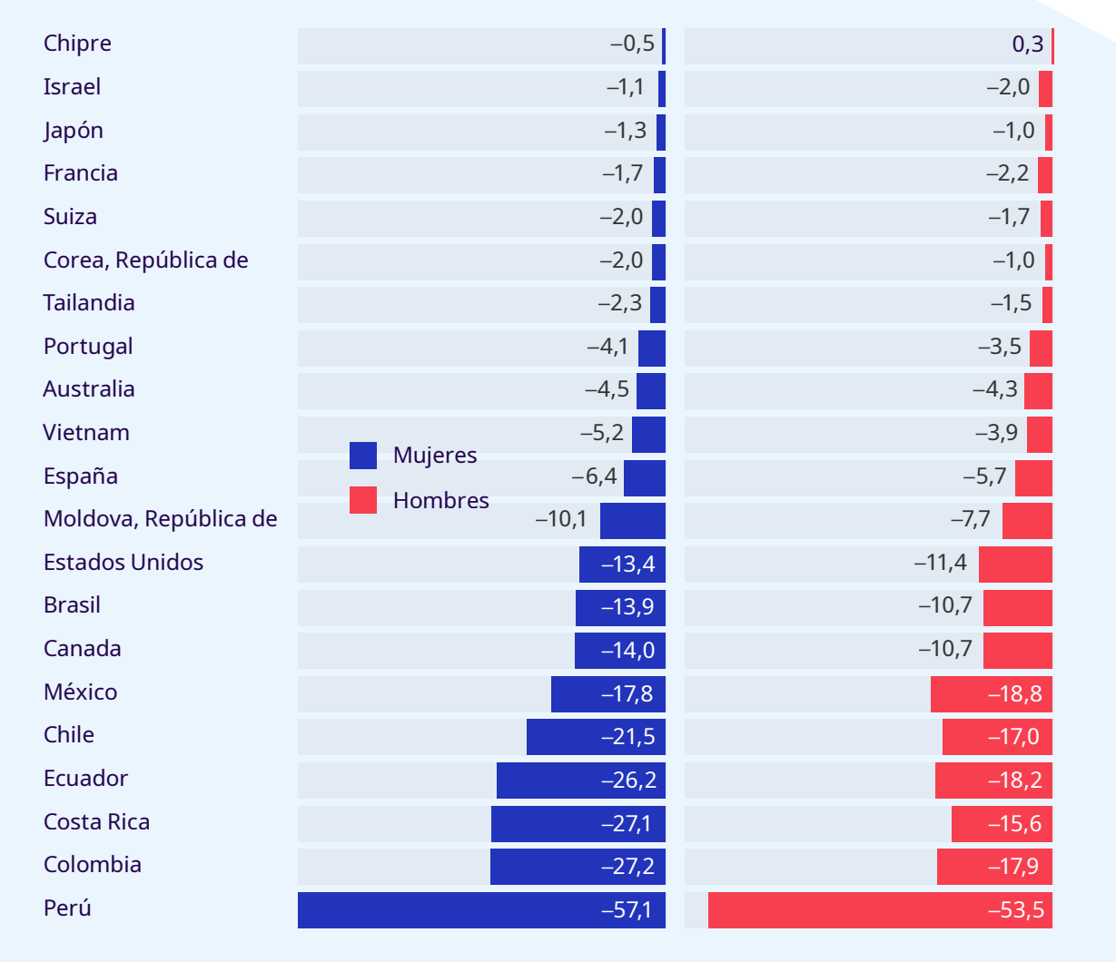Reducción del empleo de T2/2019 a T2/2020, por sexo, en varios países (valores porcentuales)