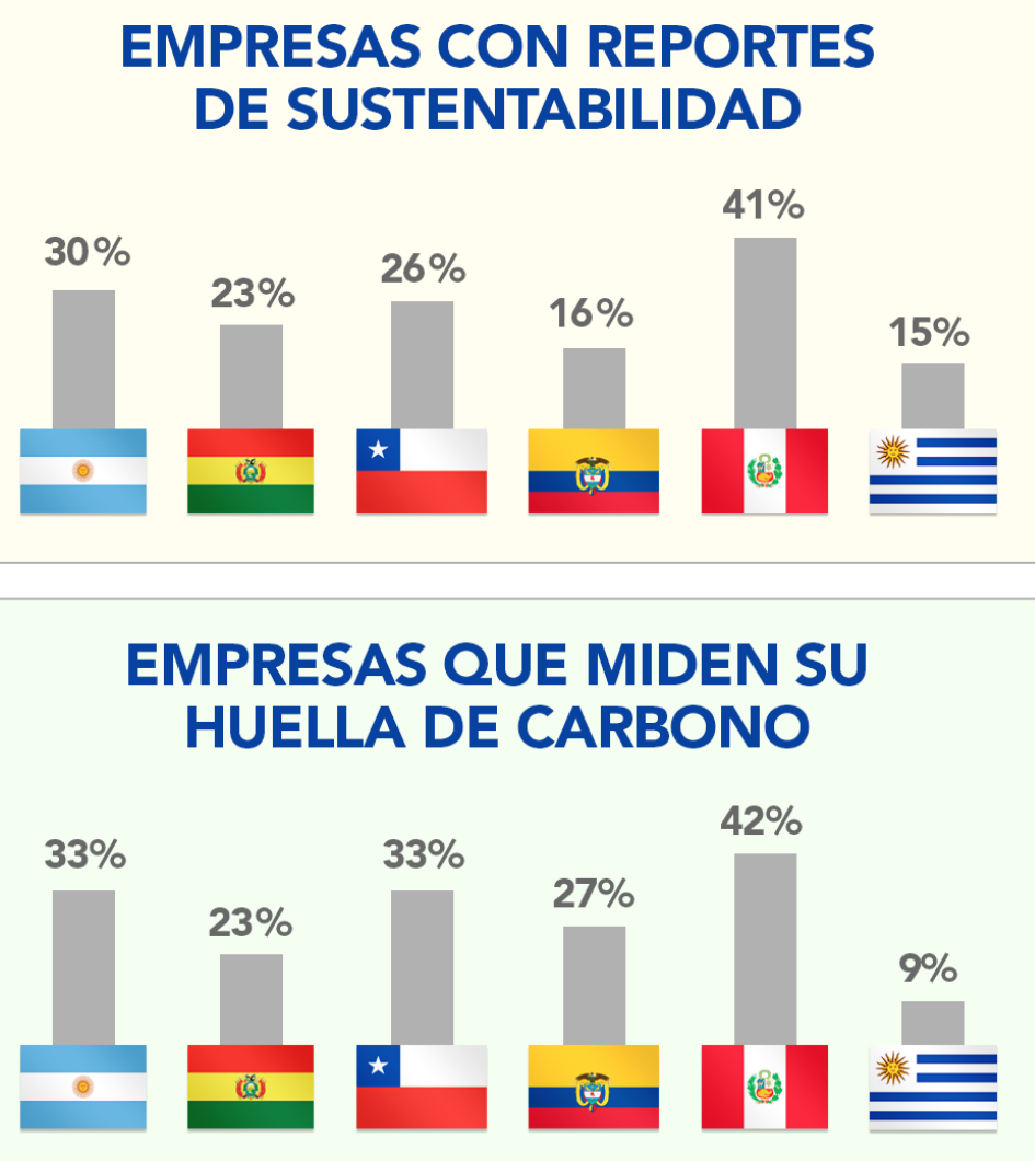 En cuanto a las empresas que realizan reportes de sustentabilidad, Perú se destacó con un 41% de ellas, seguido por Argentina con un 30%, luego Bolivia y Chile, y finalmente Colombia y Uruguay.