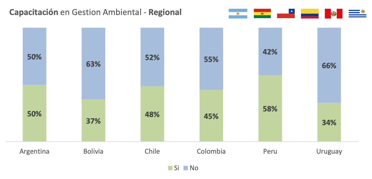 Según el estudio, a nivel regional es posible ver que las empresas en los distintos países se comportan de manera similar. La gran mayoría de ellas forma y capacita a sus empleados en gestión ambiental. Argentina, Chile y Perú resaltan entre la muestra dado que aproximadamente la mitad de las empresas encuestadas tiene programas de esta índole.