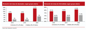 El gremio empresarial agrega que, de acuerdo con la Encuesta Nacional de Hogares (Enaho), en el Perú la cantidad de trabajadores jóvenes desempleados que buscaba activamente empleo pasó de 422,962 a 635,045 entre 2019 y 2020, lo que representa un incremento en la tasa de desempleo de 4.7 puntos porcentuales (pp) hasta alcanzar un 13.1% durante el mismo periodo, cifra que supera considerablemente al 5% (+3 pp.) registrado en los adultos. «Desafortunadamente, la gran mayoría de los jóvenes que sí encontraron empleo lo hicieron en la informalidad, que empleó a 3,413,698 de ellos el año pasado, quienes representaron el 81.4% del total de dicho grupo etario, lo que también superó al 71.3% observado en los adultos», señala.