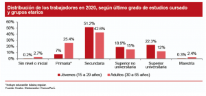 «Desafortunadamente, la población entre 15 y 29 años enfrenta limitaciones adicionales para trabajar en nuestro país, tanto así que el Ministerio de Trabajo y Promoción del Empleo (MTPE), en 2018, catalogaba al empleo juvenil como de pésima calidad, con un 75.2% de los jóvenes que percibían bajas remuneraciones, carecían de estabilidad laboral, protección social y trabajan jornadas excesivas. Esta situación se vio agravada por la pandemia, la cual perjudicó el empleo a nivel global, pero afectó más a los jóvenes, pues la cantidad de trabajadores de este grupo etario disminuyó un 8.7% el año pasado respecto de 2019, en contraste con los adultos, grupo que se contrajo un 3.7%, según la Organización Internacional del Trabajo (OIT)», señala ComexPerú.