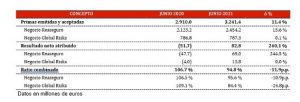 El negocio de las unidades de reaseguro y grandes riesgos, integradas en MAPFRE RE, creció entre enero y junio un 11,4%, hasta los 3.241 millones de euros, con un beneficio cercano a los 83 millones de euros, frente a unas pérdidas de 52 millones en junio de 2020. El ratio combinado también mejoró significativamente (casi 12 puntos porcentuales) y se situó en el 94,8%.