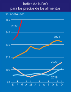 Así, el índice de precios de los alimentos de la FAO se situó en marzo de 2022 en un promedio de 159,3 puntos, es decir, 17,9 puntos (un 12,6%) más que en febrero, con un salto gigante que lo llevó a un nuevo nivel, el más elevado desde su creación en 1990. El índice de precios de los alimentos de la FAO es una medida de la variación mensual de los precios internacionales de una canasta de productos alimenticios. Consiste en el promedio de los índices de precios de cinco grupos de productos básicos.